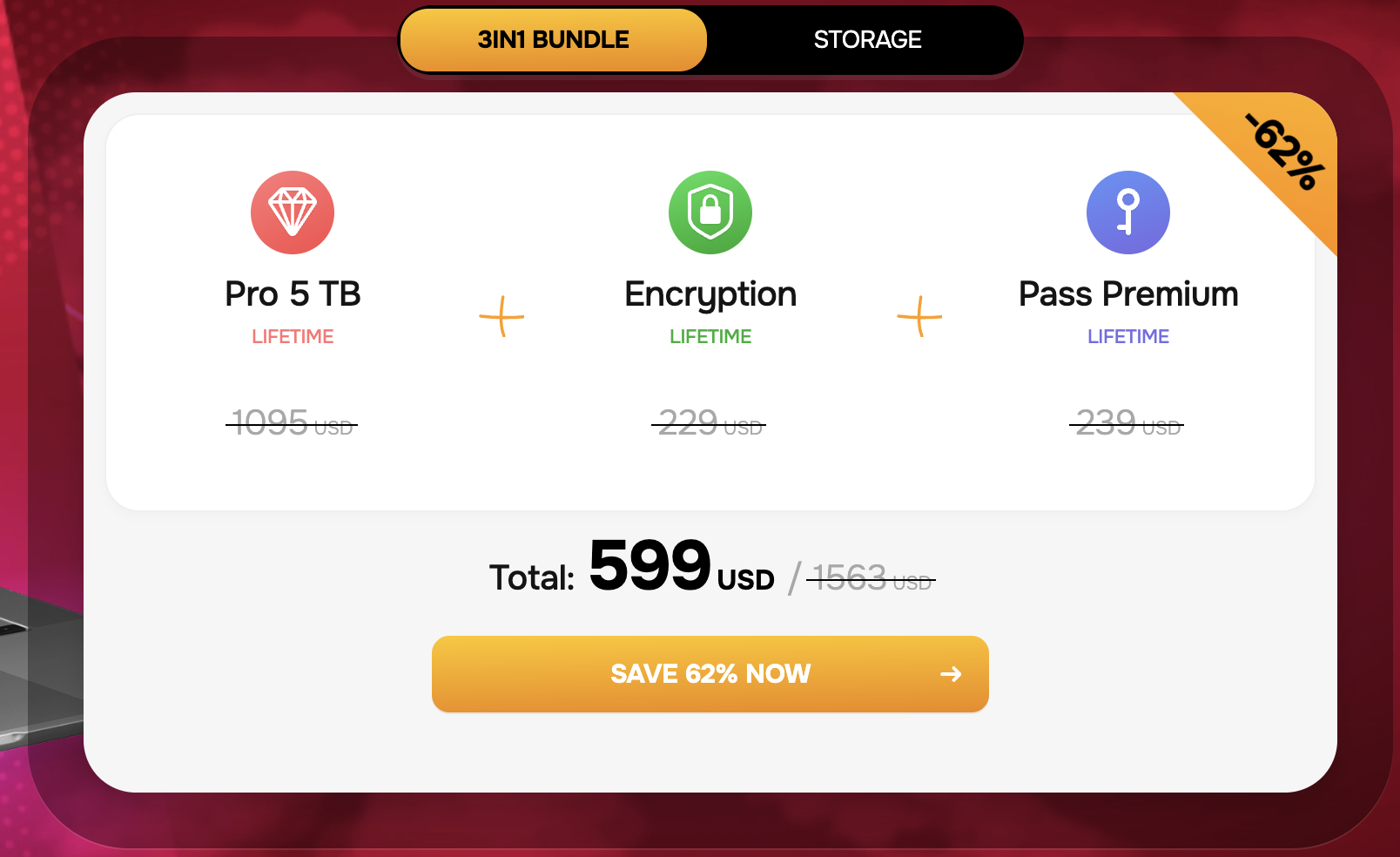 通常時は、pCloud クラウドストレージの5TBプラン 1095USD・E2E暗号化オプション 220 USD・パスワードマネージャ「pCloud Pass Premium」 239USD の合計 1563 USDなので、脅威の62%オフになっています。