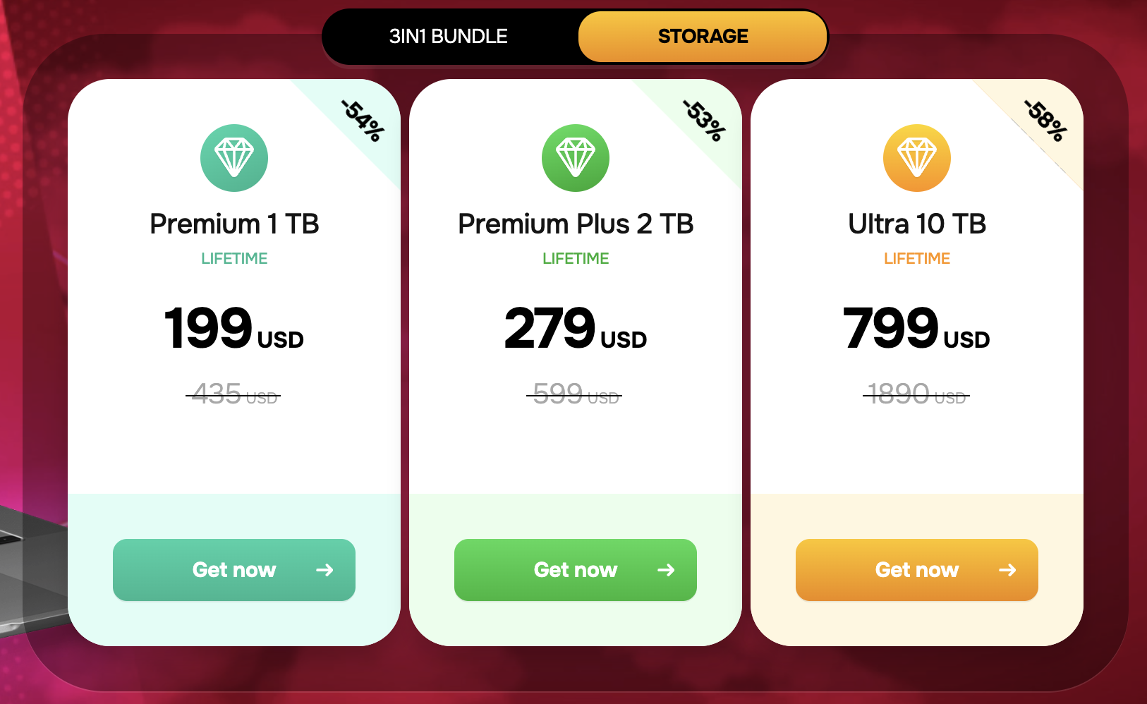 料金は、1TBプランが199USDドル/2TBプランが279ドル/20TBプランが799ドルとなっています。